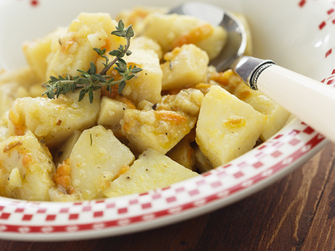 Pommes de terre, crème fraîche, poulet, œuf et Mozzarella.